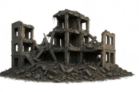 Decaying concrete structure isolating architectural remnants of destruction, symbolizing urban devastation against clean transparent backdrop