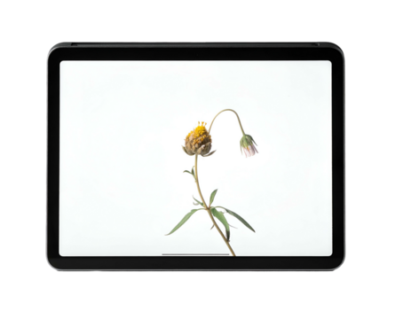Single wilting flower with yellow top on tablet screen