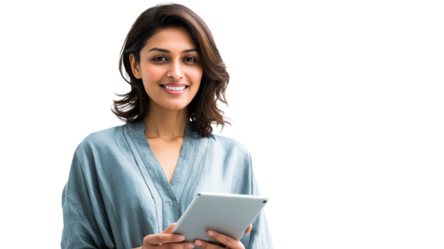 Smiling Indian woman holding a digital tablet with a confident expression, ideal for technology, business, education, or modern lifestyle applications
