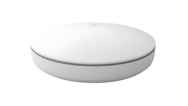 Modern, minimalist white smart home device or router with a subtle power button icon on top, sleek and rounded design, isolated on transparent background.