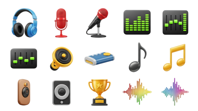 Collection of colorful music and audio icons including headphones and microphones isolated on transparent background