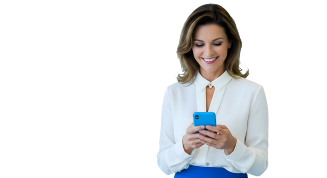 Smiling professional woman happily engaging with her smartphone, embodying modern digital communication, connectivity, and productivity in a contemporary setting