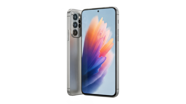 Smartphone with colorful screen and clear case isolated on transparent background