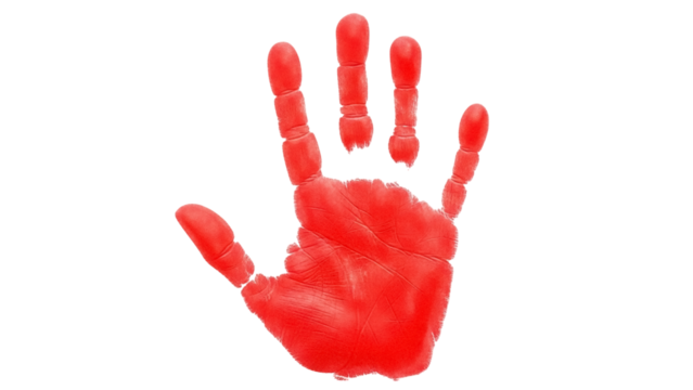Red handprint PNG isolated on transparent background, human palm print for art and design projects, vibrant color and detailed texture