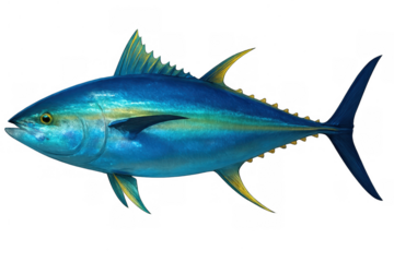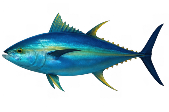 Yellowfin tuna swimming, vibrant blue marine fish with golden fins, popular seafood and fishing game animal, cut out on transparent background
