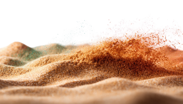 Abstract digital landscape of textured sand dunes with splashing water