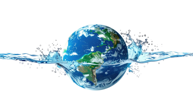 A blue sphere of the Earth globe in space with visible oceans, clouds, and continents like America and Europe in a black universe view