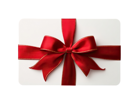 A white gift card with a red satin ribbon and bow