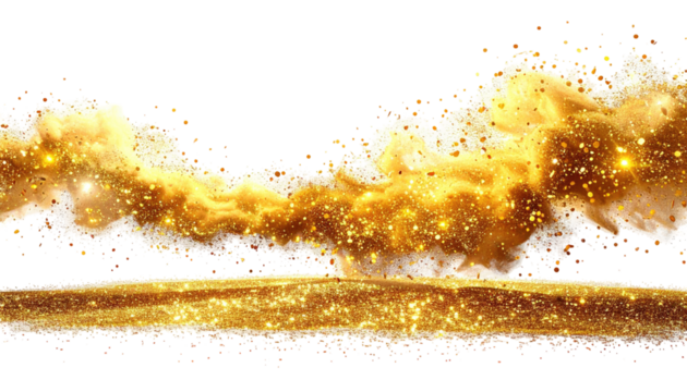 Gold cosmic explosion, ethereal and dramatic.  A golden, sparkling nebula, or cloud, erupts from a flat gold surface against a black backdrop.  Particles and glitter details add texture