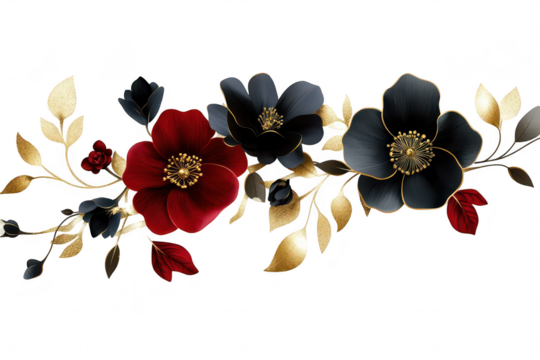 A stunning arrangement of black and red flowers with golden leaves set against a white background. perfect for use in invitations. greeting cards. or digital designs