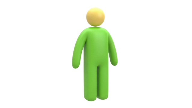 Isolated person in green with yellow head, standing attentively and alone, three-dimensional