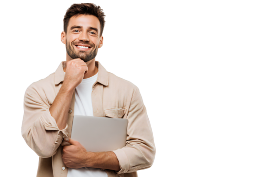 Smiling young man with beard holding laptop, confident casual style in shirt and t-shirt, isolated on white background