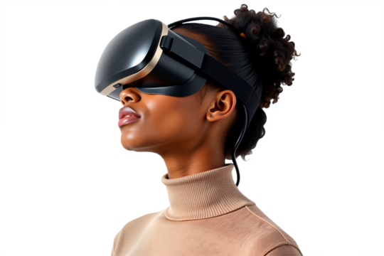VR headset portrait of African American woman isolated on transparent background. Studio shot for technology, metaverse, gaming, UI design, and digital innovation concepts.