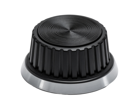 Sleek black brushed metal volume knob on transparent background