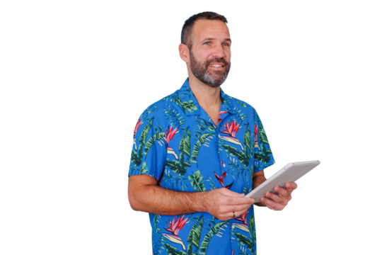 Mature bearded man wearing a vibrant hawaiian shirt, holding a digital tablet and smiling on transparent background