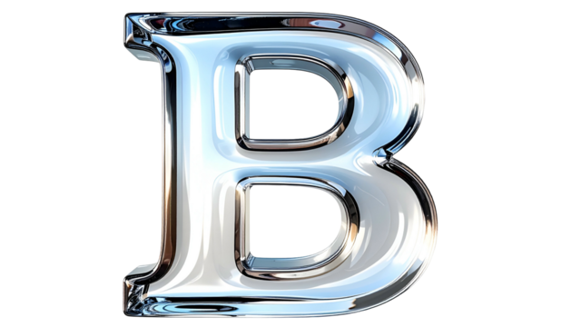 A 3D rendered, shiny silver letter "B" isolated on a pure black background. The reflective surface gleams, highlighting curves