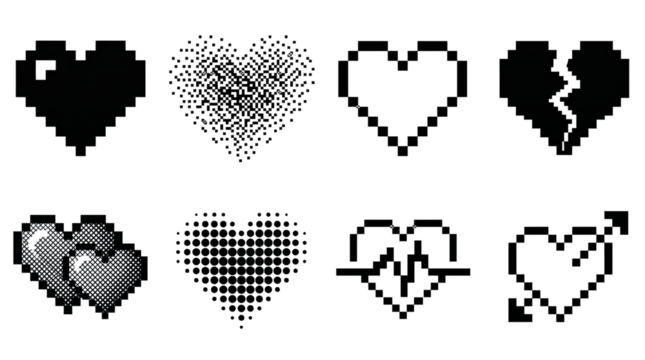 Pixel art heart set including solid, halftone, broken, cupid, and heartbeat variations isolated. Retro gaming and digital romance collection.