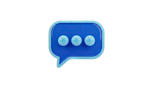 Blue 3d speech bubble icon representing online chat and messaging, displaying three dots indicating text message typing or thoughtful communication on transparent background, png