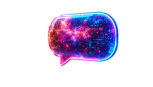 Glowing cosmic speech bubble, vibrant neon colors on black background