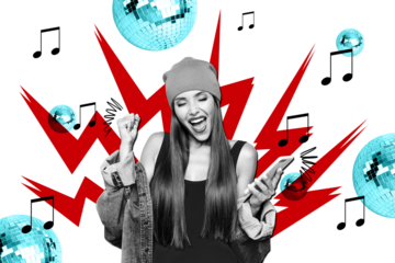 Composite photo collage of happy girl hipster hold iphone device music event disco party note melody relax isolated on painted background