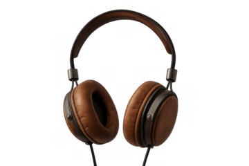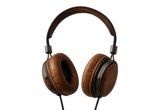 Vintage style headphones featuring brown leather and metal details, enjoying music and quality sound, transparent background