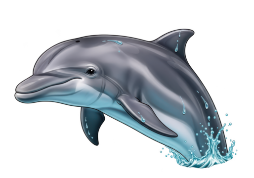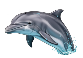 A playful dolphin jumping out of water with splashes and droplets on transparent background