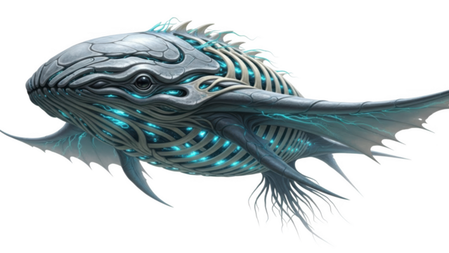 Bioluminescent mechanical whale creature with glowing blue energy alien fantasy