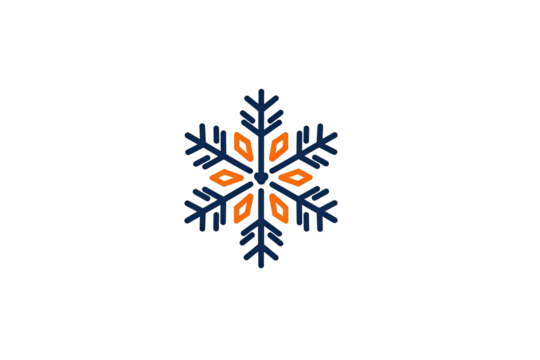 A stylized snowflake featuring blue outlines and orange diamond shapes set against a black background