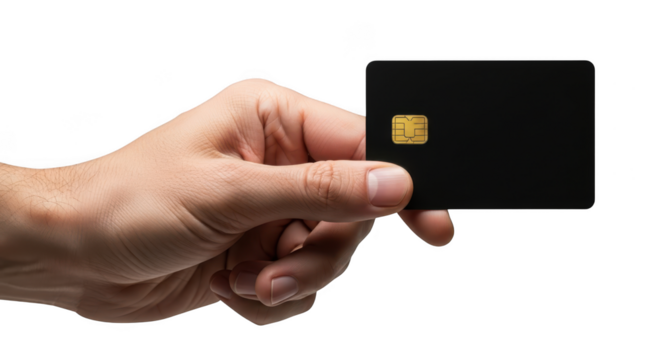 Female hand holding black card blank isolated on white background, transparent PNG cutout, business payment credit debit gift card mockup for social media post, web banner, 4K high-quality download