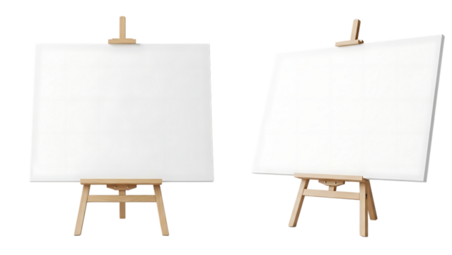 Blank white canvas on a wooden easel from two different perspectives