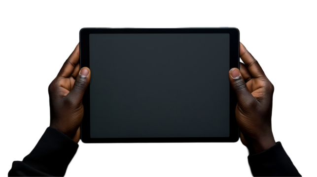Hands Holding Tablet Dark Modern Device, Blank Screen for App and Tech Displays, isolated on transparent background.