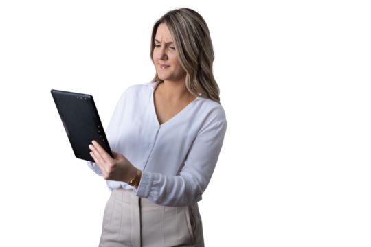 Businesswoman looking confused while reading a digital tablet