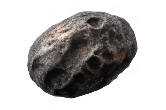 Asteroid or meteoroid object with rocky, cratered surface on transparent background, science and space concept