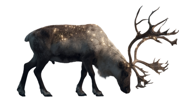 Majestic reindeer with glowing light particles fantasy wildlife animal antlers winter night illustration isolated on white background