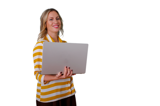 Cheerful businesswoman holding a laptop, showing digital content and remote work success with a confident smile, transparent background