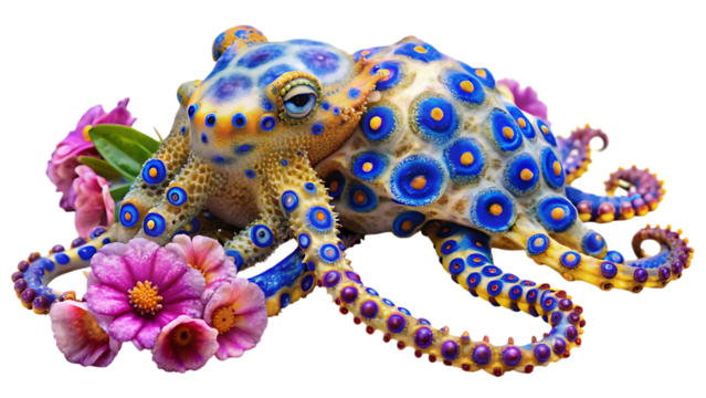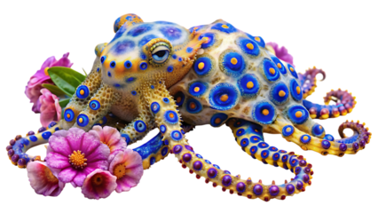 Red-orange ringed planet with blue rings on transparent background