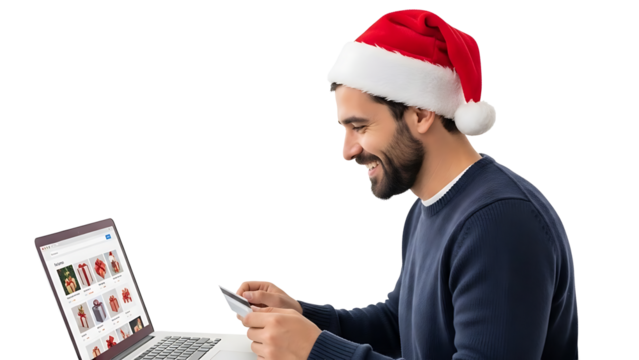 Man using a laptop and credit card while wearing Santa hat, depicting online Christmas shopping