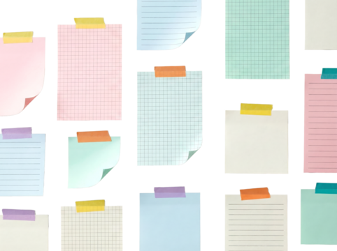 Set of Colorful Lined and Grid Paper Notes with Washi Tape Vector isolated PNG with Transparent Background