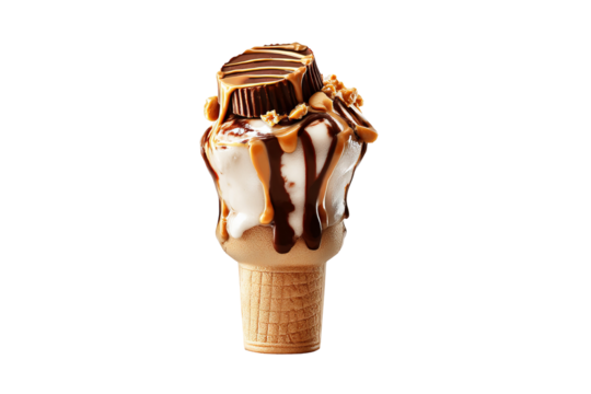 Creamy peanut‑butter‑cup chocolate ice‑cream scoop with visible swirls and candy chunks, isolated on transparent PNG background, perfect cutout element for dessert menus, digital scrapbooking