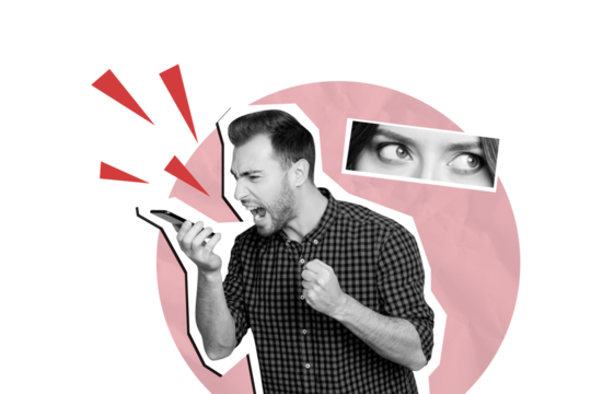 Composite trend artwork image photo collage of young man business bossy hold phone call scream furry bad mood fired lady eyes watch