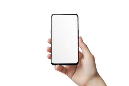 Hand holding smartphone with transparent png screen in modern office setting