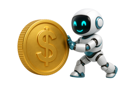 Cute little white astronaut robot character pushing a giant shiny golden dollar coin representing financial growth and a strong successful future isolated on transparent background
