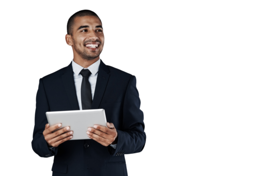 Business man, tablet and smile or networking, connection and internet or digital technology. Male person, information and planning or research, mobile app and isolated on transparent png background