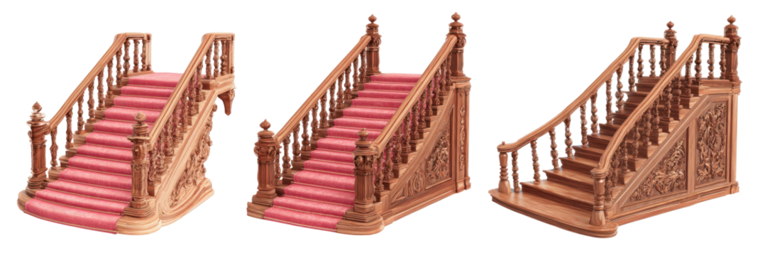 Three ornate wooden staircases with pinkish-red carpeting.  Detailed carvings adorn the balustrades and stairwell