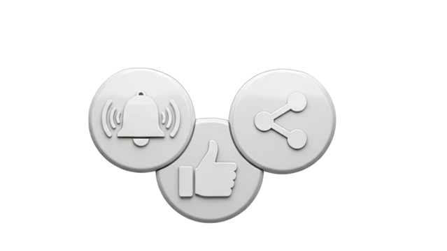 3D Social Media Icons: Like, Share, and Bell Notification on transparent background