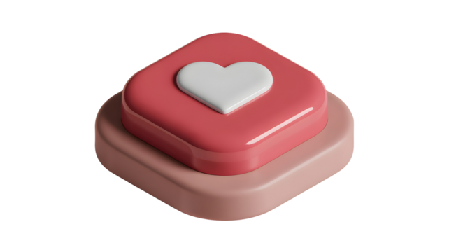 Isometric 3d rendering of a glossy pink like button icon with a white heart symbol on black