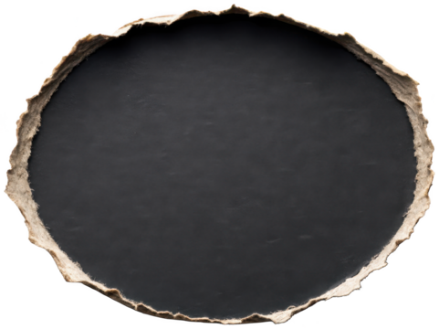 Distressed, roughly torn circular paper frame with a dark gray central area and ragged edges exhibiting a textured, fibrous quality, presented against a, isolated on transparent background.