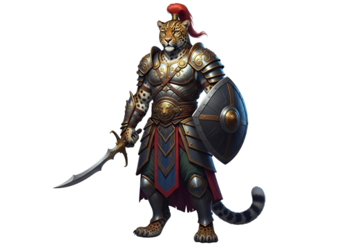 A formidable warrior, clad in ornate armor, panther-like features, and holding a sword and shield, stands against a black background.