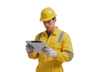 Smiling Industrial worker in blue uniform and yellow gloves holding a tablet, ready for work, isolated on white or transparent background
