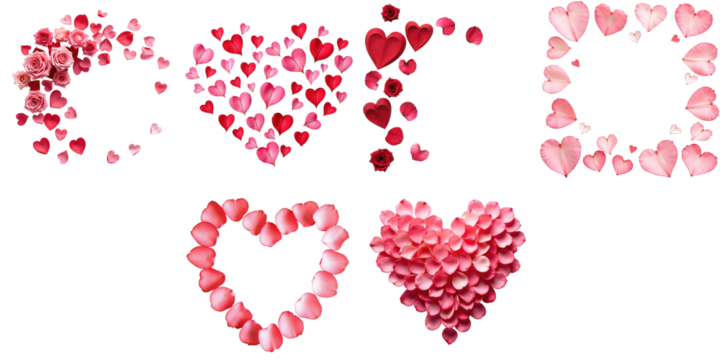 Rose petals arranged in heart shapes with various sizes and designs on a transparent background, ideal for romantic themes and decoration in digital media and print.